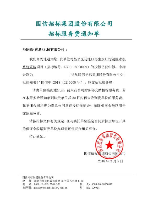 堅納森中標(biāo)昌平區(qū)馬池口再生水廠污泥脫水機(jī)系統(tǒng)采購項目